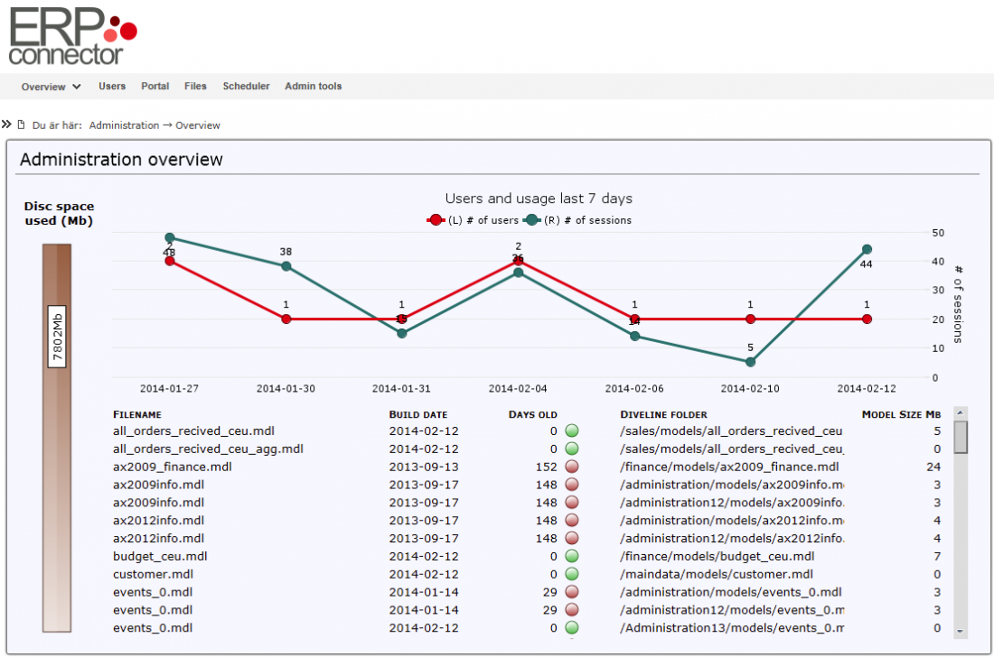 Administrationsmiljön presenteras med ett antal rapporter i webbportalen DivePort. Dessa delas upp i uppföljning av modeller, portal och användare följt av avancerad uppföljning för användare och schemalagda aktiviteter.
